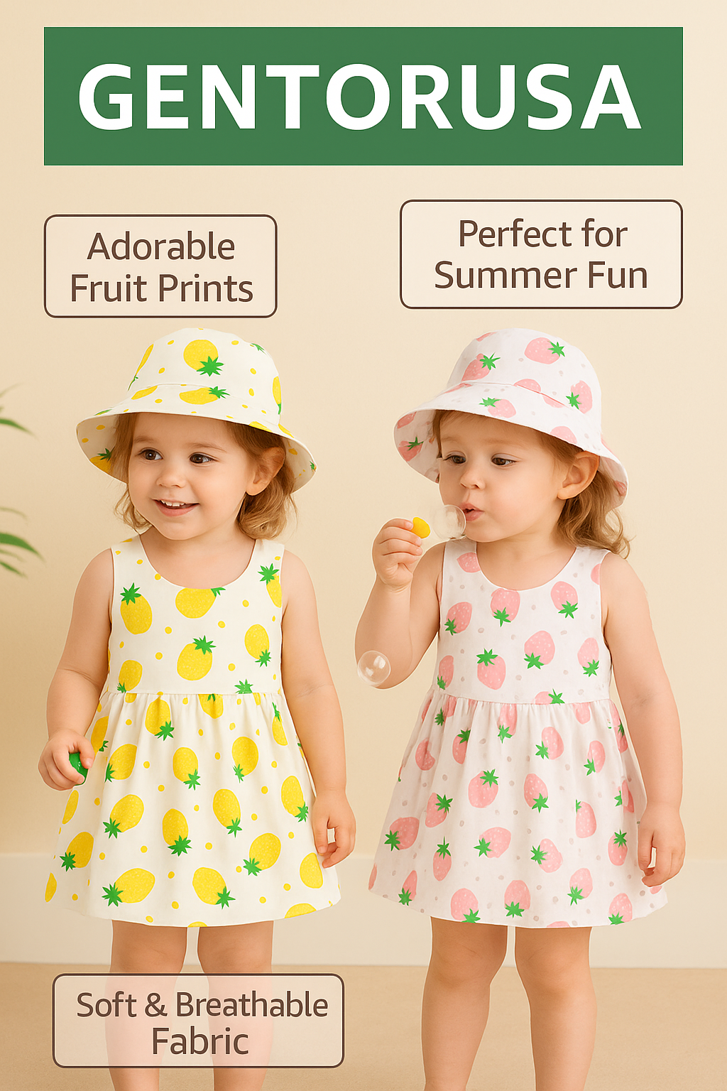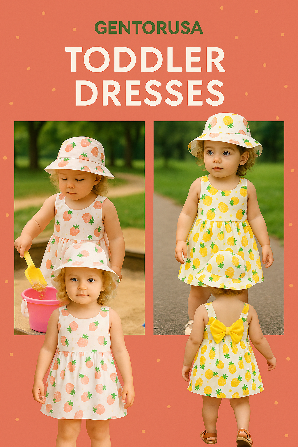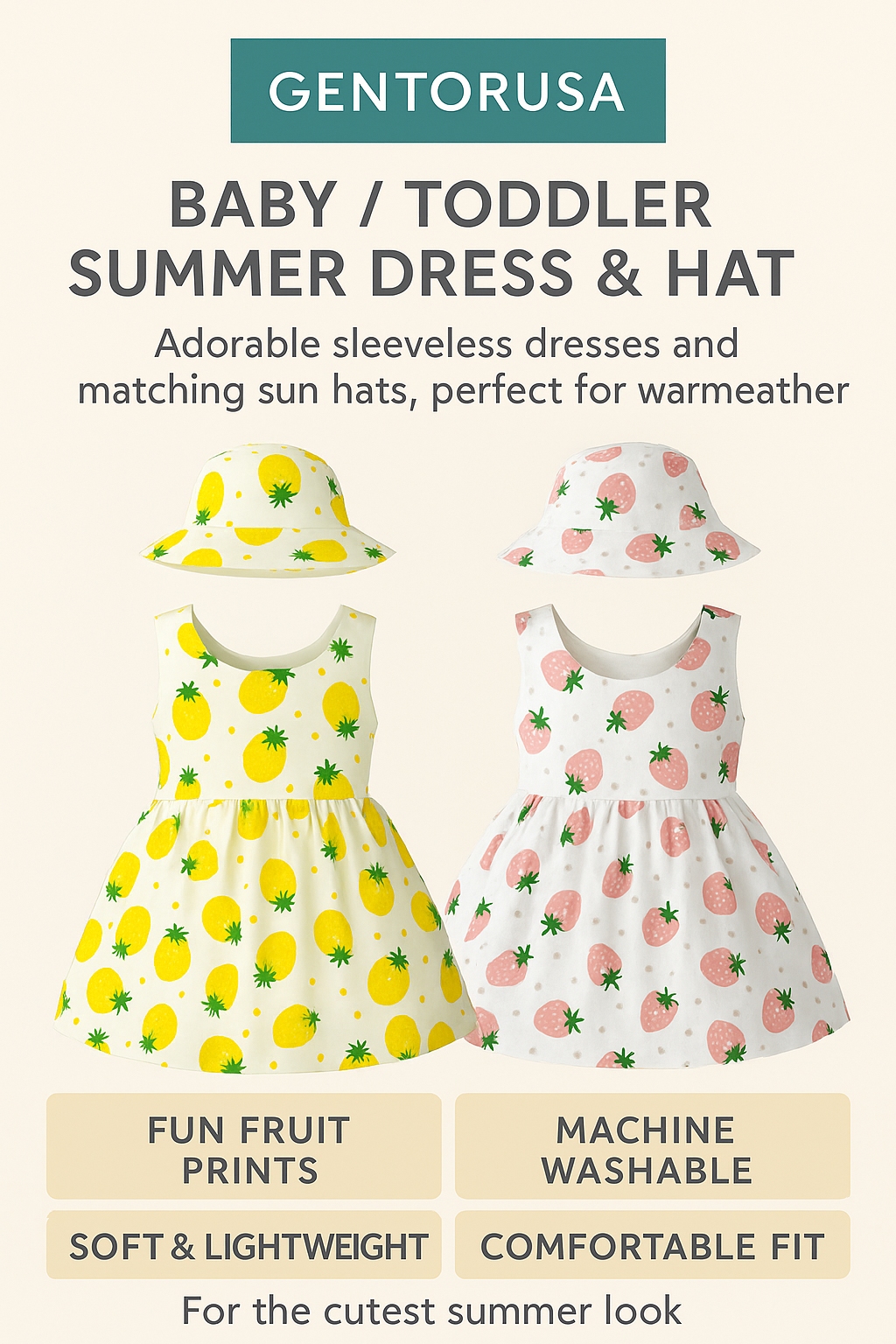 Keep your little one cool and cute in this toddler summer dress and hat set. Featuring fun fruit prints, soft breathable fabric, and a comfy sleeveless fit- perfect for sunny days, park paly and everyday wear.