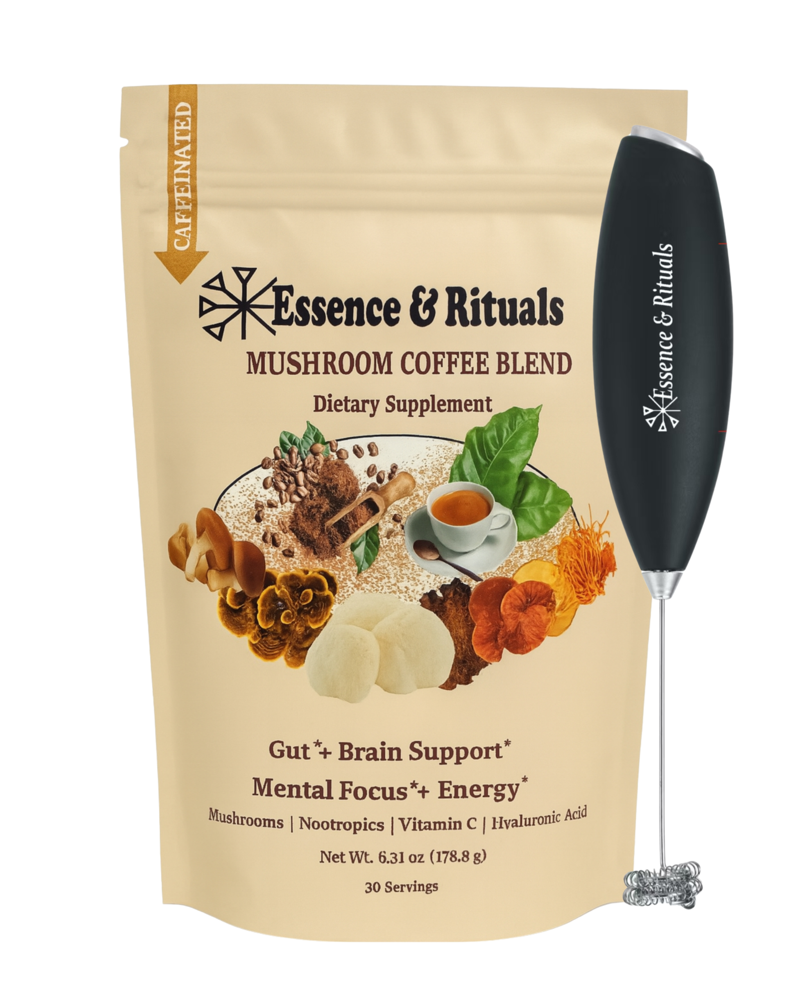 Discover the power of functional coffee with Essence & Rituals Mushroom Coffee Blend. Crafted with organic Lion’s Mane, Reishi, and Chaga, and immune support- without the jitters.