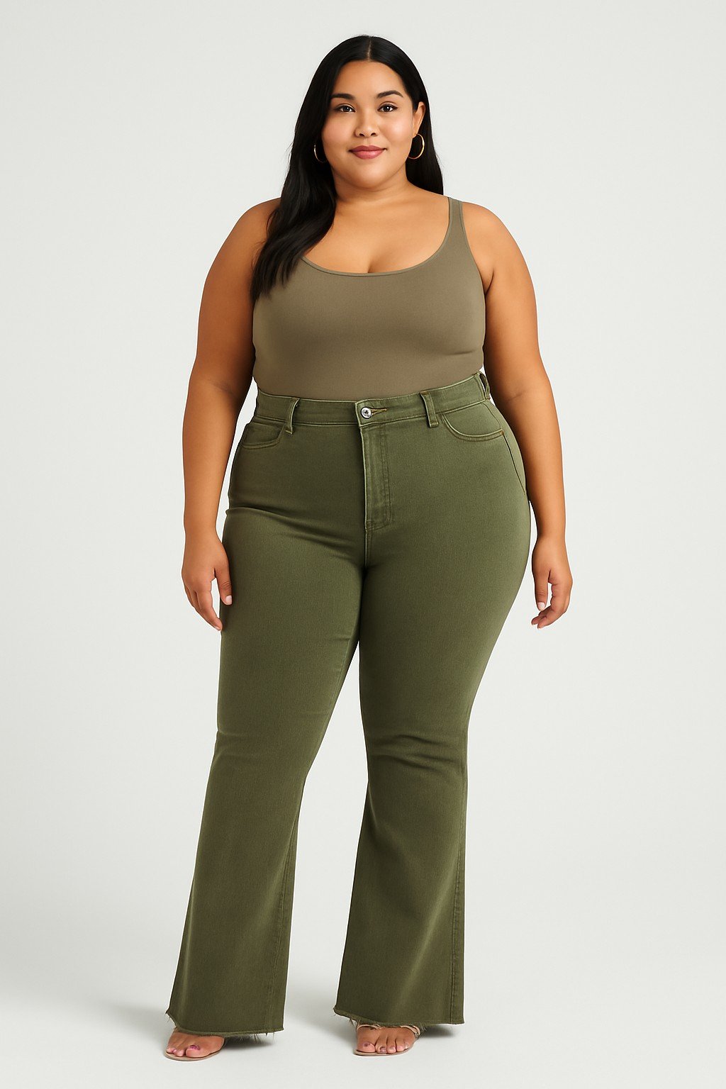 Discover the perfect blend of style and comfort with these High- Waisted Olive Green Flared Pants. Designed with a tailored fit and a flattering flared silhouette, these pants are ideal for casual outings, office wear, or formal events. The high- rise waist and button- front detail enhance their sophisticated look, while the olive green shade adds a touch of modern elegance.