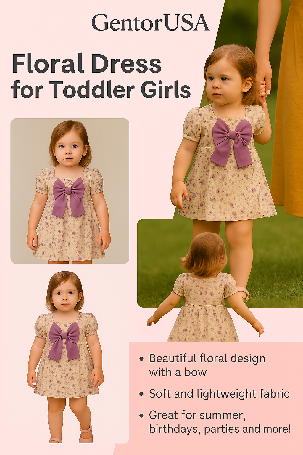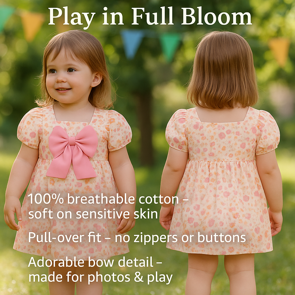 Lightweight and breathable, it’s perfect for birthdays, family photos, or everyday twirls. The floral print and gathered skirt offer a timeless, picture-ready look, while the pull- on design ensures easy dressing.